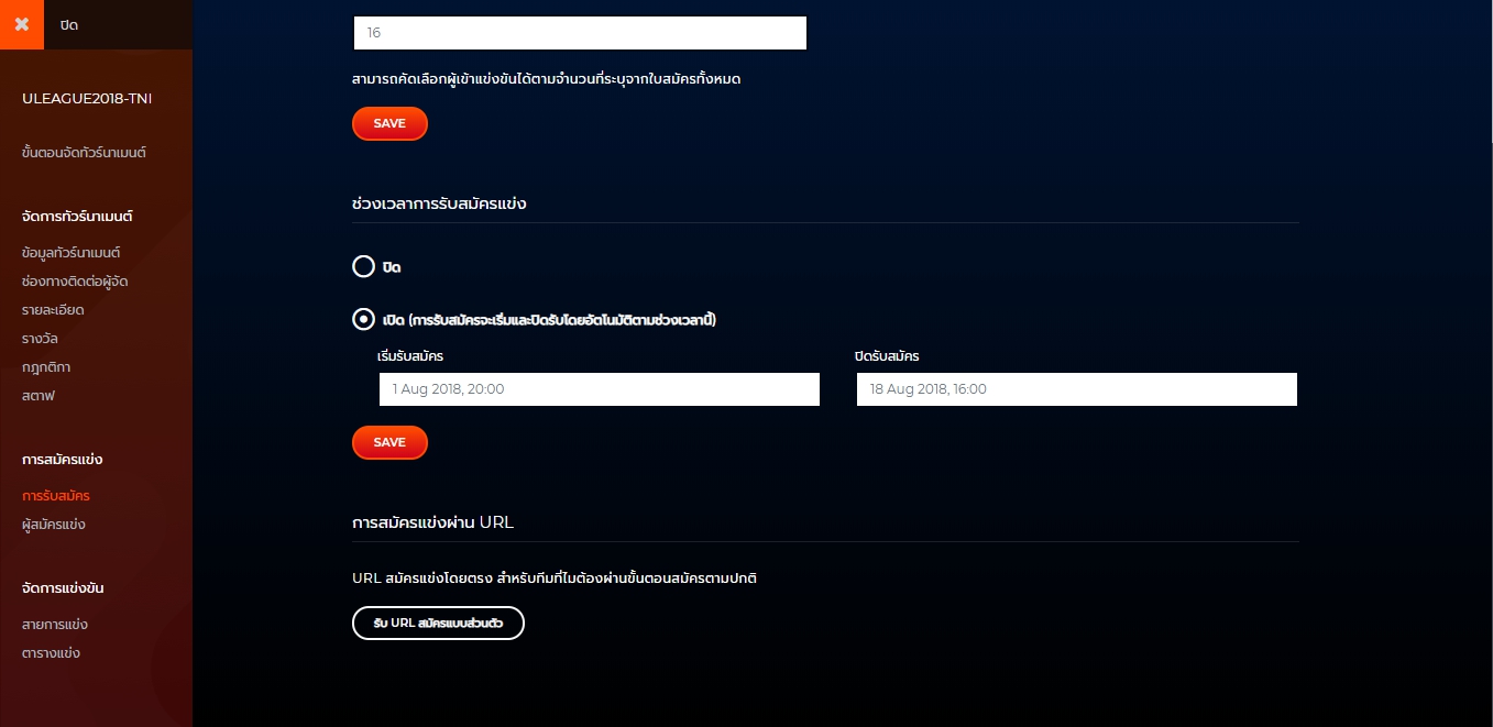 หากคุณไม่ต้องการเปิดรับสมัครผ่านหน้าทัวร์นาเมนต์สามารถทำได้โดย เลือกปิด ในหัวข้อช่วงเวลาการรับสมัครแข่ง